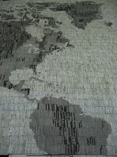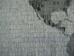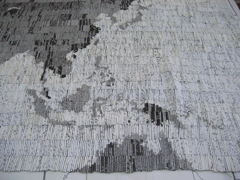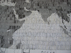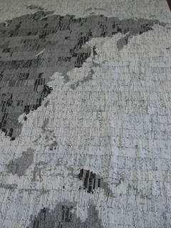 ‘Letters from the bank 1996 – ‘ is an ongoing map of the world constructed from letters from the bank, and envelopes from my bank statements. The work came about through a desire to transform these nasty, or just mundane, pieces of paper into something new, something extraordinary. Its form – the map of the world- reflects on how these things (bank letters) can absorb your energy and mental space, becoming your whole world.